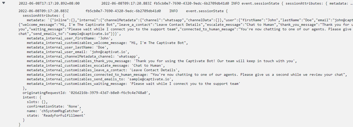 The key name for each customizable variable is metadata_internal_customizables_*.This screenshot below shows the customizable messages in the sessionAttributes object of the sessionState of a Lex event.